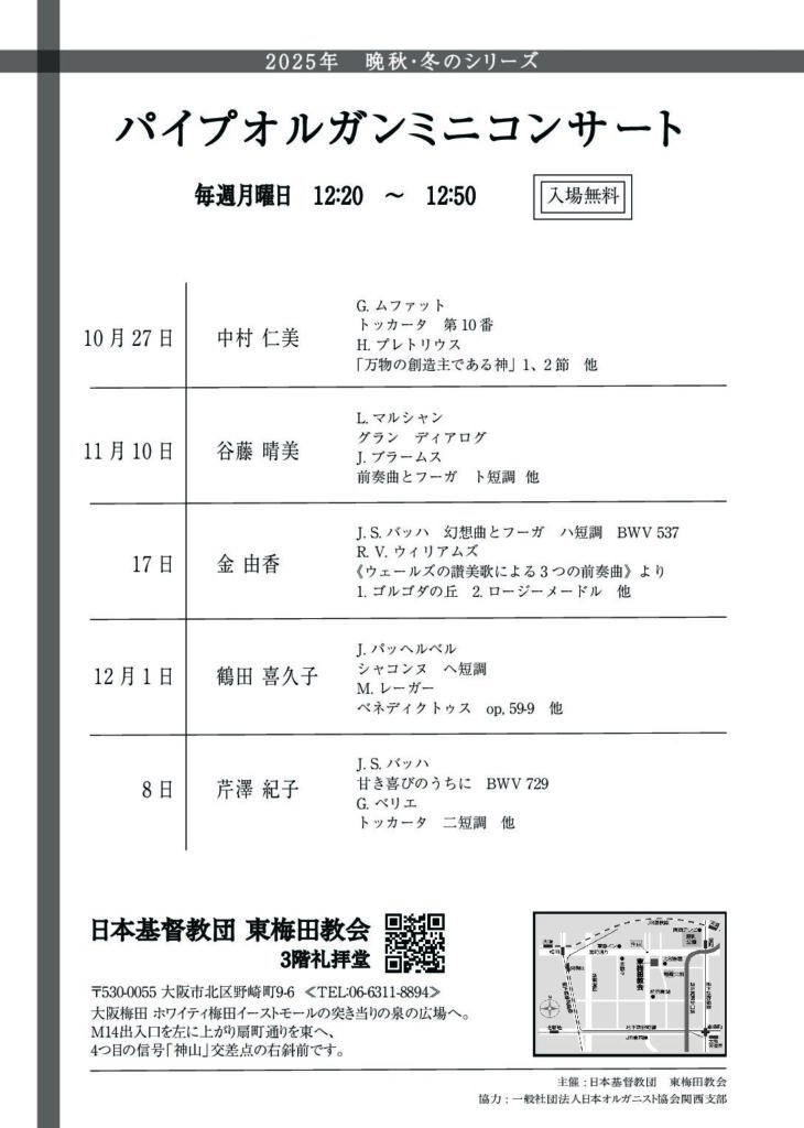 パイプオルガンミニコンサート 次回シリーズの予告 2025年10月17日 最終更新日時 : 2025年10月17日 higashiumeda ★パイプオルガンミニコンサートの2025年晩秋・冬のシリーズのご案内をいたします。