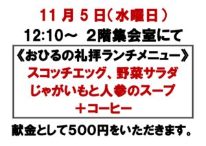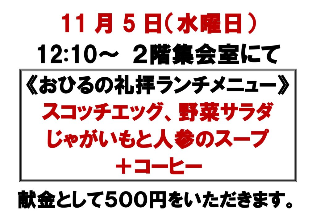 11月5日(水曜日)のおひるの礼拝ランチメニューです。お待ちしています❣❣
