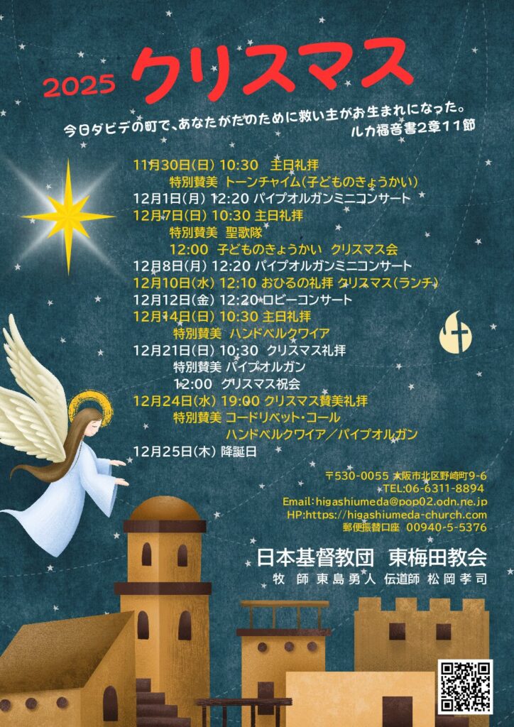2025年クリスマスのご案内 2025年11月18日 最終更新日時 : 2025年11月18日 higashiumeda ★2025年の東梅田教会のクリスマスのご案内をいたします。 それぞれの集会に、どうぞお出かけください。お待ちしています。☆彡