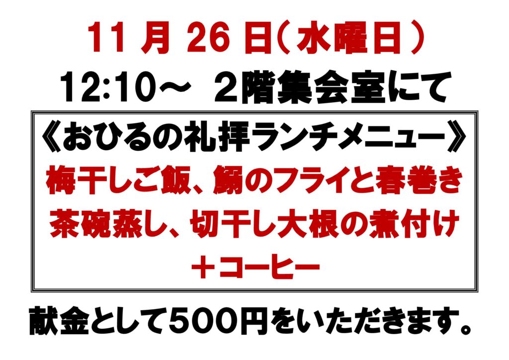 11月26日(水曜日)のおひるの礼拝ランチメニューです。お待ちしています❣❣