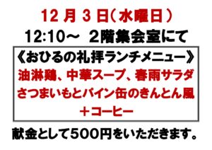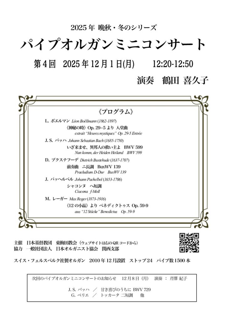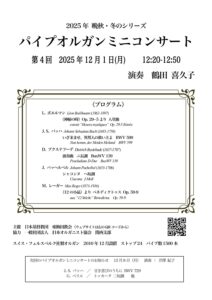 パイプオルガンミニコンサートの次回予告 2025年11月30日 最終更新日時 : 2025年11月30日 higashiumeda ★2025年12月1日(月曜日)のパイプオルガンミニコンサートのお知らせです。
