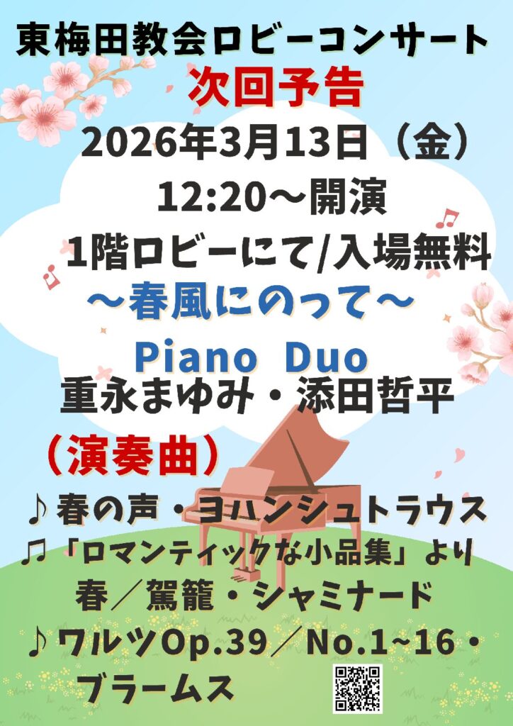 ロビーコンサートの次回予告 2026年2月13日 最終更新日時 : 2026年2月13日 higashiumeda 2026年3月13日(金曜日)12:20~ 1階ロビーにて開催いたします。入場無料です。お待ちしております❣❣