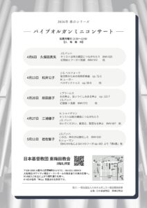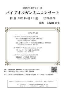 パイプオルガンミニコンサートのご案内 2026年4月3日 最終更新日時 : 2026年4月3日 higashiumeda 2026年4月6日(月曜日)のパイプオルガンミニコンサートのご案内を致します。 お待ちしております。