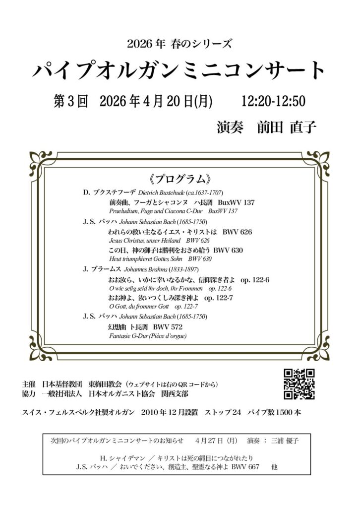 パイプオルガンミニコンサートのご案内 2026年4月17日 最終更新日時 : 2026年4月17日 higashiumeda 2026年4月20日(月曜日)のパイプオルガンミニコンサートのご案内を致します。 お待ちしております。